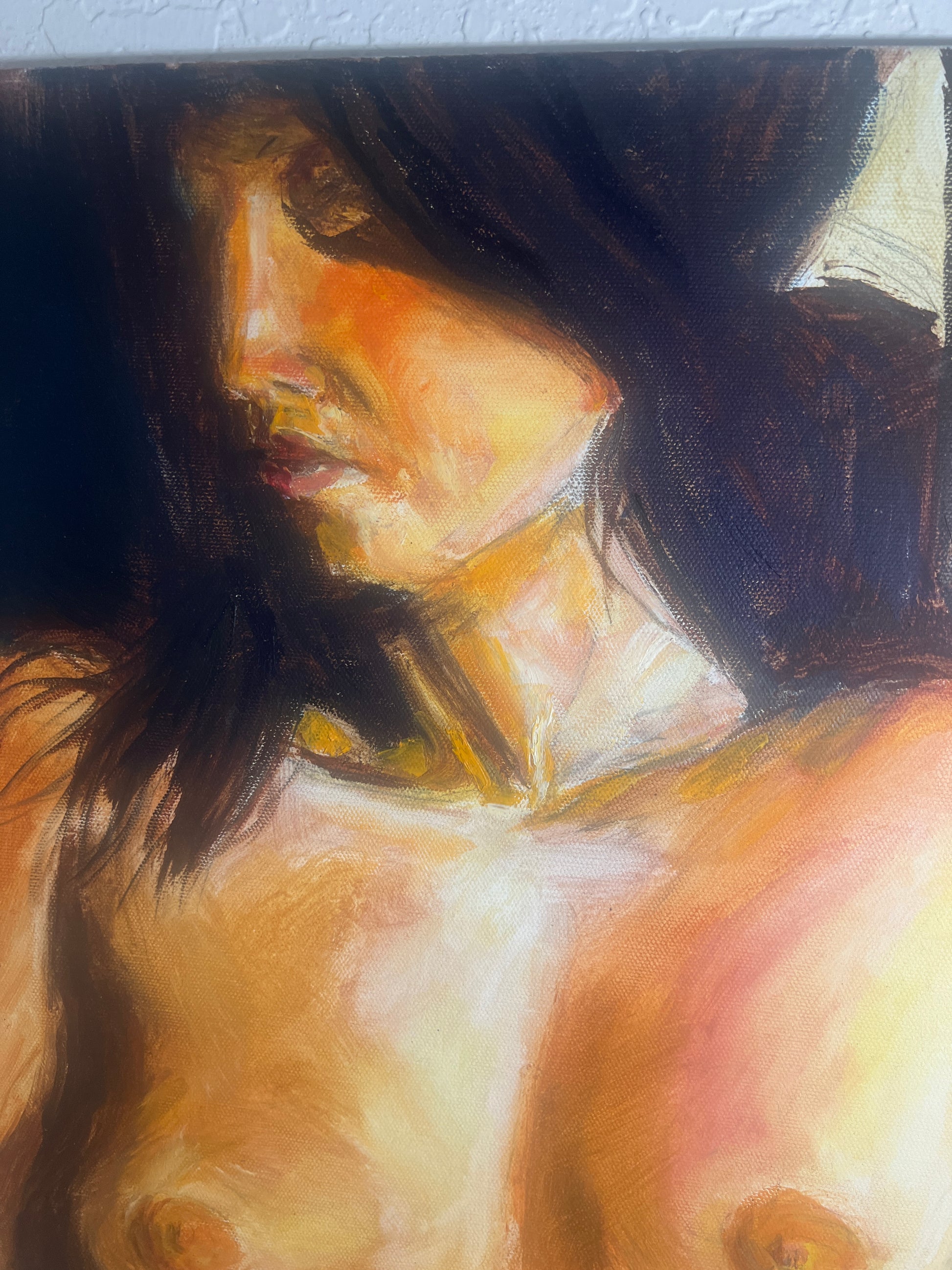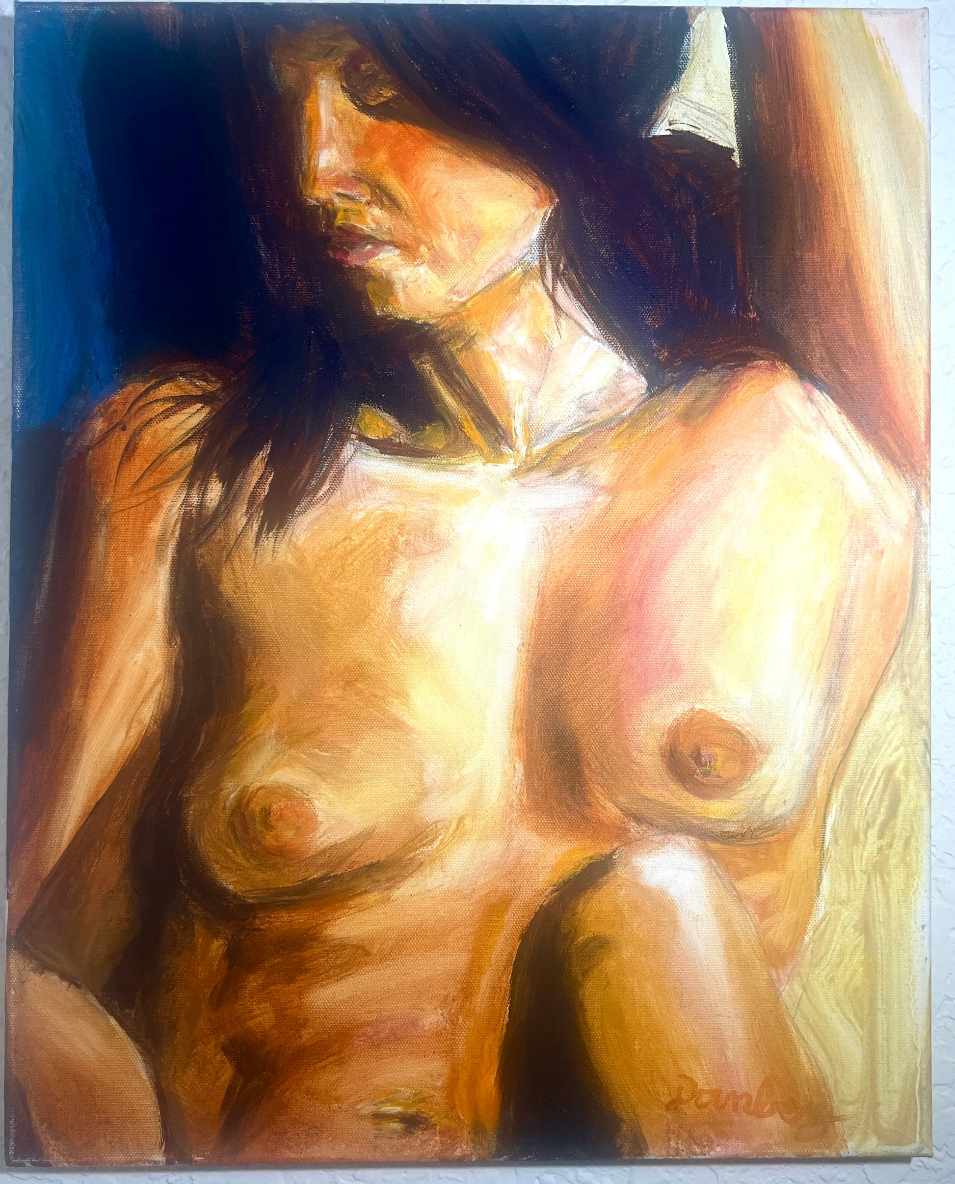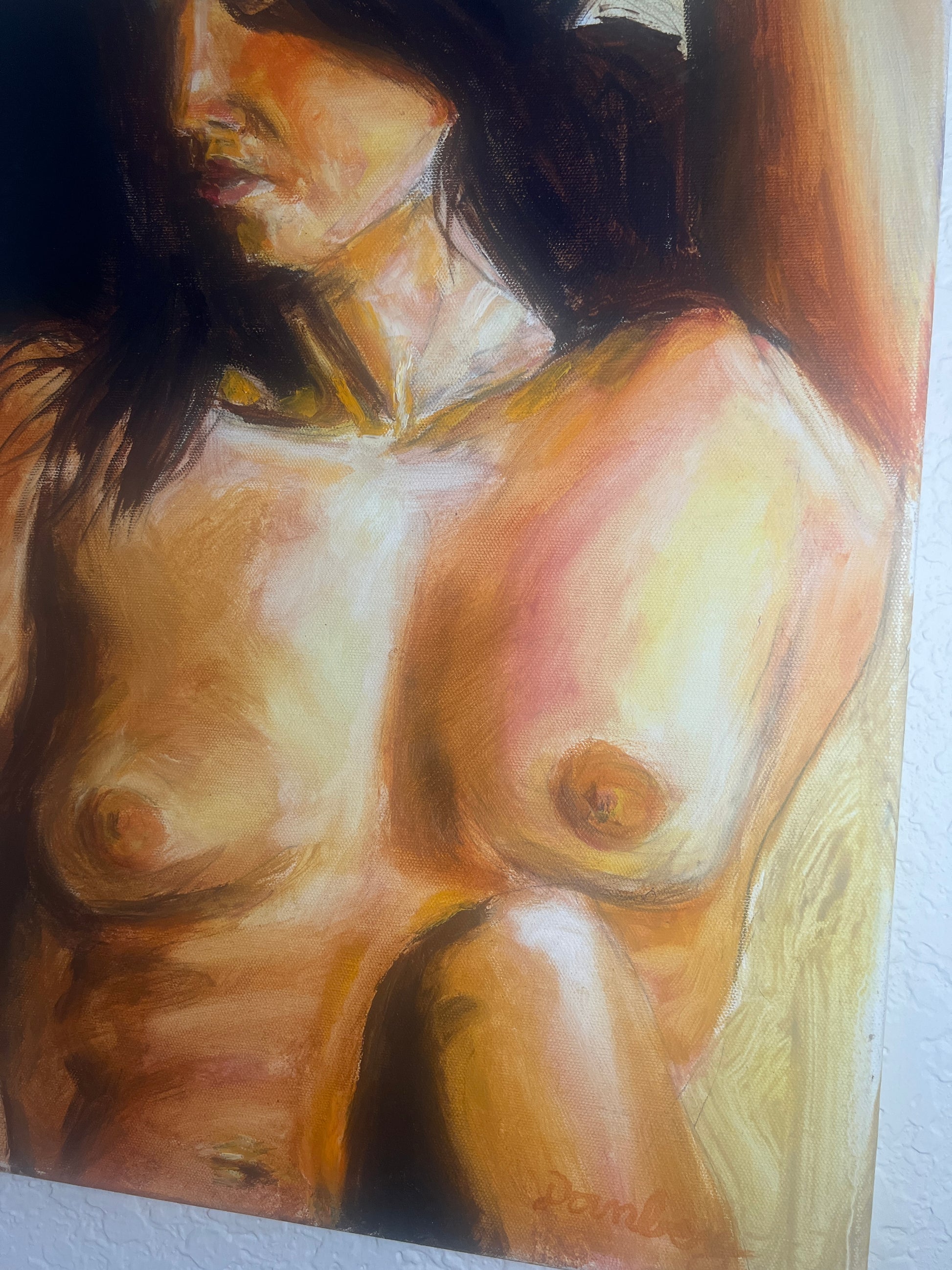 As a pairing, the two canvases are strongest displayed together. One panel holds tension in stillness; the other folds inward in quiet vulnerability. The work bridges realism and abstraction, capturing not the accuracy of anatomy, but the sensation of being present in the room.